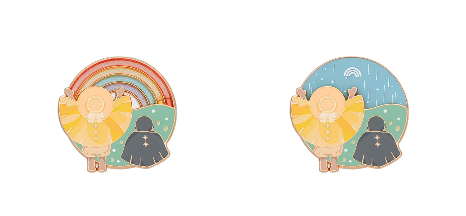 The clear paint finish on the Rainbow Spell Pin shows a rainbow on the surface when light passes through.
