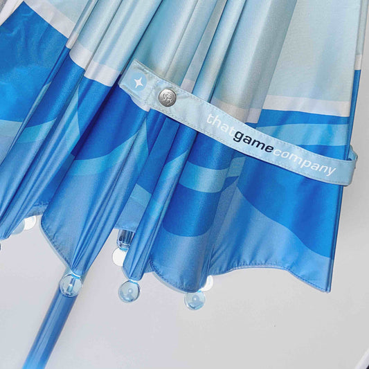 是的,我们以高度还原追光者雨伞为目标,雨伞的伞面、12骨伞架、手柄、伞珠及伞帽等都尽量参照了游戏雨伞本身设计及颜色。我们对伞珠尺寸进行了特殊定制,并采用手工缝制(因手工缝制比机器更加牢固)。在设计伞柄朝向的时候,设计师特地还原了游戏中玩家撑伞的朝向细节。当玩家在现实中用游戏里握伞的方向举起雨伞,现实中的伞面图案会与游戏里的图案一致。在研发过程中为保留游戏里追光者雨伞的12伞骨、颜色及设计,我们特别定制了每一个部件,并多次对配件材质、图案颜色、拼接效果进行优化,最终呈现出这版游戏还原度最高的追光者雨伞。